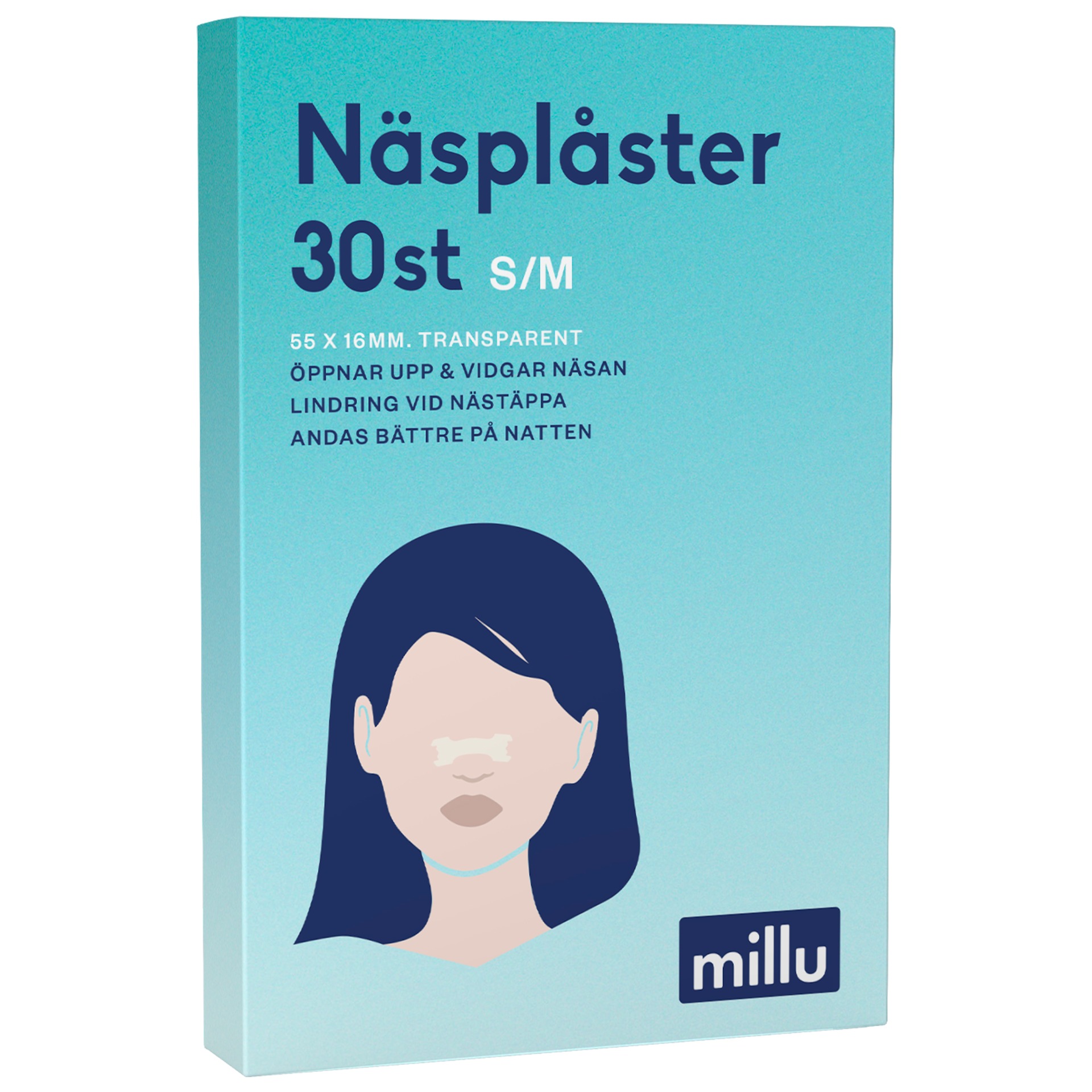 Millu näsplåster används för att vidga näsgångarna och underlätta andningen vid tillfällig nästäppa orsakad av förkylning eller allergier. Näsplåster kan även användas på natten för att minska snarkningar.